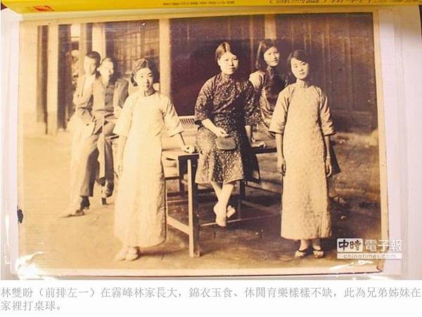 林雙盼(前排左一)在霧峰林家長大,錦衣玉食、休閒育樂樣樣不缺,此為兄弟姊妹在家裡打桌球。