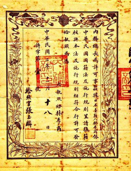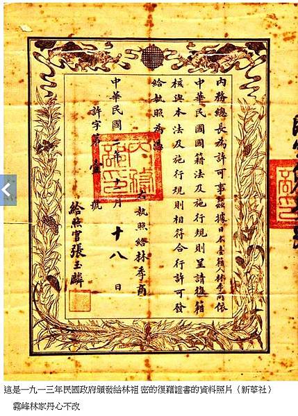 一 九 一 三 年 民國 政府 頒發 給 林祖密 的 復籍 證書
