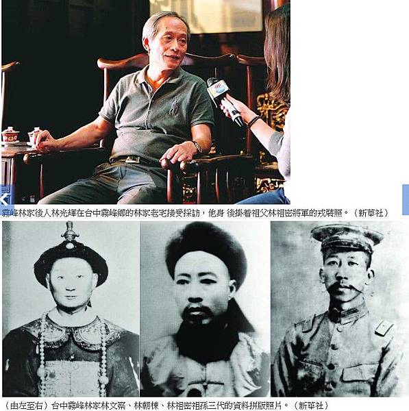 (由左至右)台中霧峰林家林文察、林朝棟、林祖密祖孫三代的資料拼版照片。(新華社)