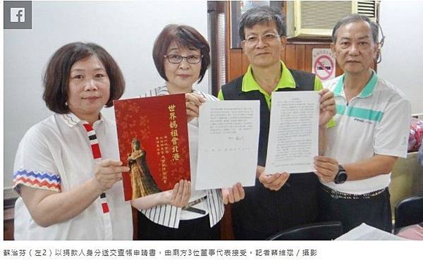蘇治芬(左2)以捐款人身分遞交查帳申請書,由廟方3位董事代表接受。記者蔡維斌/攝...