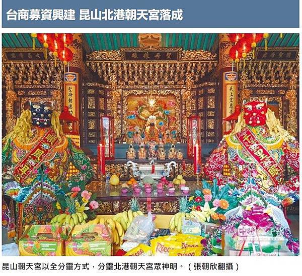 媽祖信仰源於大陸、在台灣發揚光大,雲林北港朝天宮致力兩岸宗教文化交流,繼3年前以全分靈方式在廈門協助台商興建閩南朝天宮,12日再度於江蘇昆山協助當地台商,舉辦媽祖安座儀式。