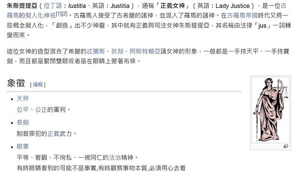 Justitia(正義女神)司法女神/一名裸露胸膛的婦女,手持天秤及長劍,並有時戴有眼罩/由代表正義的古希臘法律女神忒彌斯(Themis)及古羅馬命運女神福爾圖娜(Fortuna)的形象混合而成/正義女神經常被造成帶眼罩之形象,代表其客觀、不徇私、一視同仁的平等精神。 @ 姜朝鳳宗族 :: 痞客邦 :: http://tinyurl.com/y4jmljhv