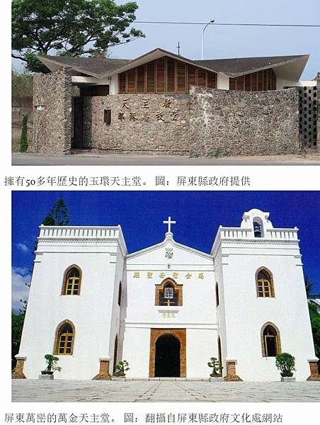 比較特別的是這座集結不同族群心力建造而成的「玉環天主堂」,今年(2017年)4月「復活節」後,縣府與天主教高雄教區合辦歷史建築新埤「玉環天主堂」修復完成暨重新啟用典禮,眾人到場見證原先荒廢又重新「復活」的奇蹟,玉環天主堂於1965年由德國道明會規劃設計,呈現德國人的簡潔線條與精準風格,參與建築工事的有當地玉環新村浙江披山島移民「大陳義胞」與鄰近客家、閩南、排灣等多族群,是一段集結眾人心力的美麗建築。