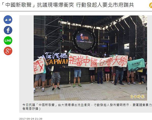 分享「中國新歌聲」抗議現場爆衝突 行動發起人要北市府踹共到Facebook 分享「中國新歌聲」抗議現場爆衝突 行動發起人要北市府踹共到Line 分享「中國新歌聲」抗議現場爆衝突 行動發起人要北市府踹共到Google+