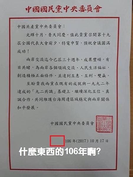 中共18日開始舉行為期7天的第19次全國代表大會,但國民黨發給中共的賀電中,卻隻字不見「中華民國」,遭網友砲轟是「窩囊廢賀電」。(圖擷取自PTT)