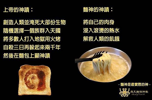 看到這裡你可能會覺得這是什麼邪教,在某種意義上麵條神教確實是邪教:祂的「信徒」其實大多是無神論者或不可知論者,他們藉由扮演麵神的信徒,來諷刺那些信上帝的人。麵條神教的禱告詞以「RAmen」結尾,是「阿門」和「拉麵」綜合起來的發音。你可以想像,麵神的信徒和臺灣最保守的基督徒,可能會有這樣的對話:
