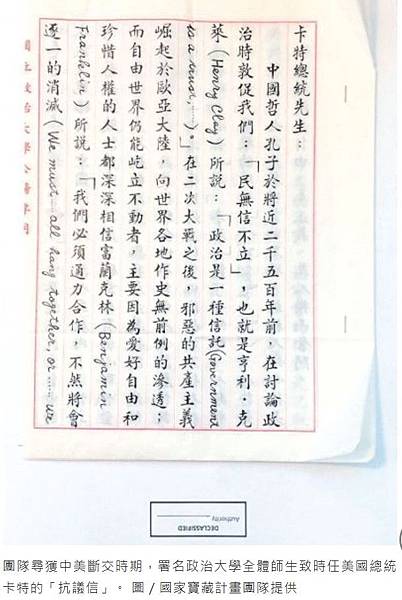 團隊尋獲中美斷交時期,署名政治大學全體師生致時任美國總統卡特的「抗議信」。 圖/...