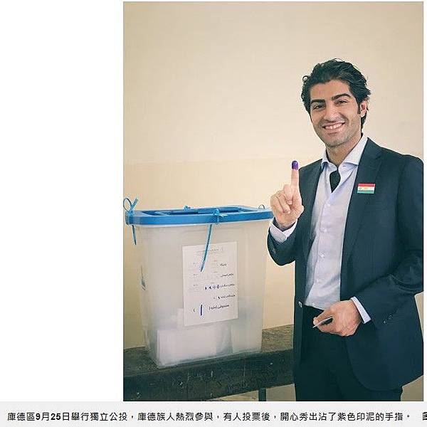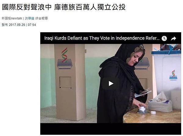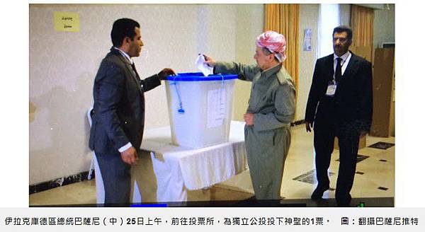 《美聯社》(AP)9月25日報導指出,位於伊拉克北境,庫德斯坦自治區內的3個省分,包括尼尼微省(Nineveh),蘇萊曼尼亞省(Sulaimaniya),吉爾庫克省(Kirkuk,當地石油醞藏豐富),總共約520萬合格選民,在925這一天透過獨立公投手段,表達庫德人建立獨立國家的決心;僅管伊拉克政府,並不承認這項公投。《路透社》(The Reuters)925當天報導指出,這次獨立公投的投票率約為78%,需要歷時72小時才會完成計票。