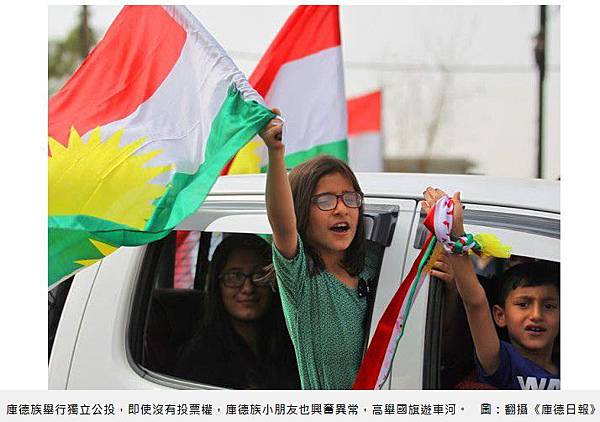庫德族舉行獨立公投,即使沒有投票權,庫德族小朋友也興奮異常,高舉國旗遊車河。 圖:翻攝《庫德日報》