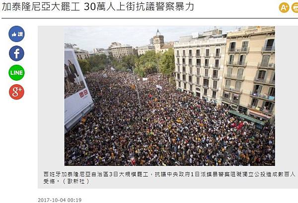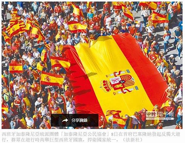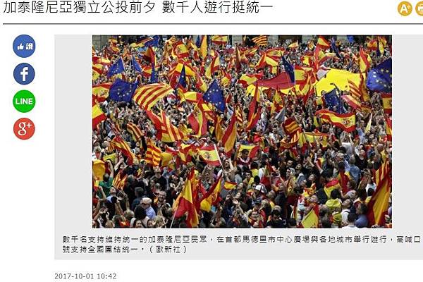 分享加泰隆尼亞獨立公投前夕 數千人遊行挺統一到Facebook 分享加泰隆尼亞獨立公投前夕 數千人遊行挺統一到Line 分享加泰隆尼亞獨立公投前夕 數千人遊行挺統一到Google+