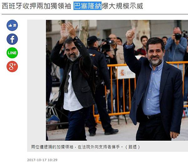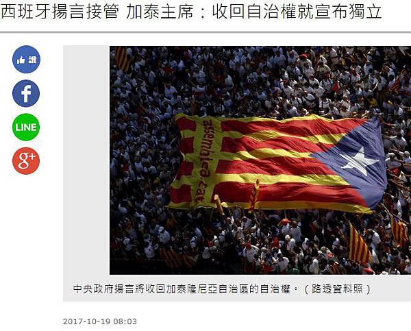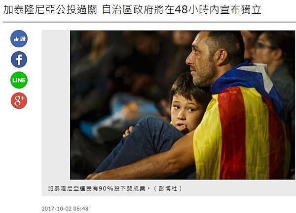 分享加泰隆尼亞公投過關 自治區政府將在48小時內宣布獨立到Facebook 分享加泰隆尼亞公投過關 自治區政府將在48小時內宣布獨立到Line 分享加泰隆尼亞公投過關 自治區政府將在48小時內宣布獨立到Google+