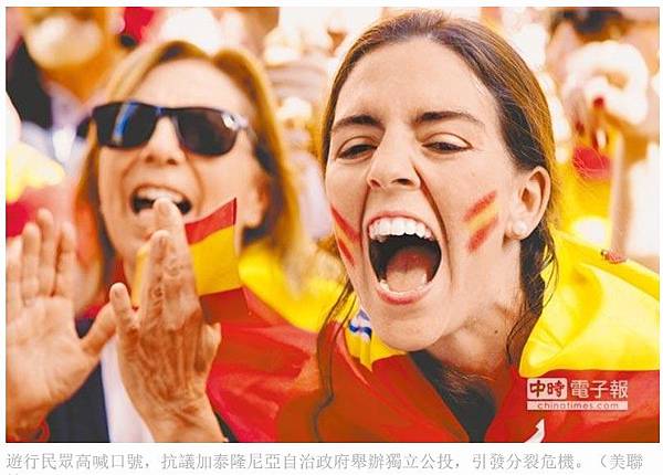 〔即時新聞/綜合報導〕西班牙加泰隆尼亞自治區獨立公投在今日舉行,西班牙政府為阻止獨立公投舉行,已下令當地警方封鎖過半數的投票所,沒收選票和投票箱、強制帶離試圖投票者;挺獨立的人民則佔領各建物、學校,欲與警方對抗到底。數千名反對獨立的當地民眾則在公投前夕,在首都馬德里市政廳前大地女神廣場(Plaza de Cibeles),高呼「我是西班牙人,西班牙人,西班牙人!」等口號,力挺西班牙統一。