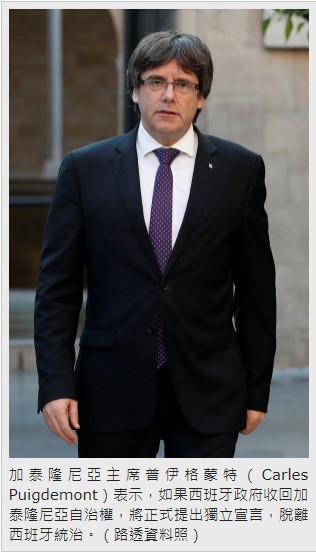 加泰隆尼亞自治區主席普伊格蒙特今天為加泰隆尼亞可能宣布脫離西班牙獨立開啟大門。
