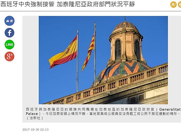 同年10月27日,加泰隆尼亞議會宣佈獨立建國。西班牙中央政府隨後決定採取史無前例的措施,啟動西班牙憲法第155條,接管加泰隆尼亞。 https://is.gd/LeWqk6