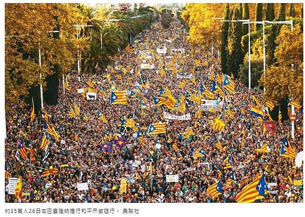 約35萬人26日在巴塞隆納進行和平示威遊行。 美聯社