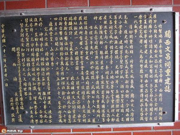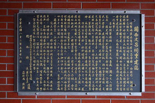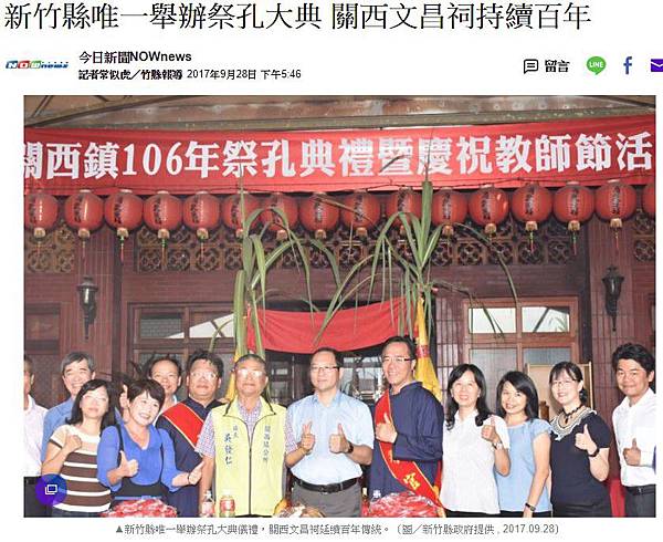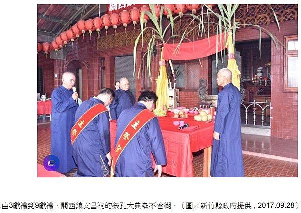 從清朝光緒年間就舉辦祭孔大典的新縣關西鎮文昌祠,儀式已舉辦100多年,並以「蒼聖嘗會」的名義舉辦,是今年竹縣唯一舉辦祭孔大典的文昌祠。