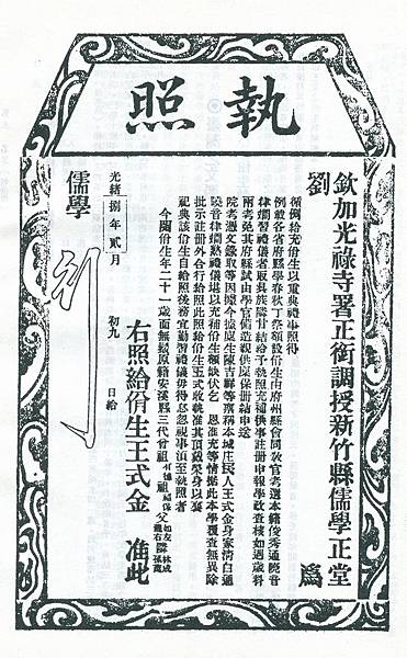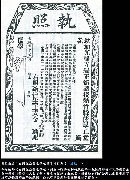 今年恰好<台灣文獻館電子報>刊出一張清朝新竹縣儒學-也就是新竹市孔子廟的前身-釋奠禮佾舞生人數不夠,廩生推薦親友來充當,新竹縣衙門的知縣大老爺審核資格可以錄用時給予的執照,由此可見清朝對聖廟釋奠禮的慎重。
