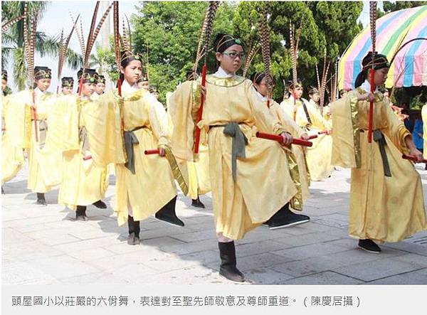 三獻禮儀式後,頭屋國小36名學童左手持籥,右手握翟,隨著雅樂的節奏獻舞,佾舞動作起落有致,每個舞姿都代表這著對孔子的尊崇與讚頌意義。