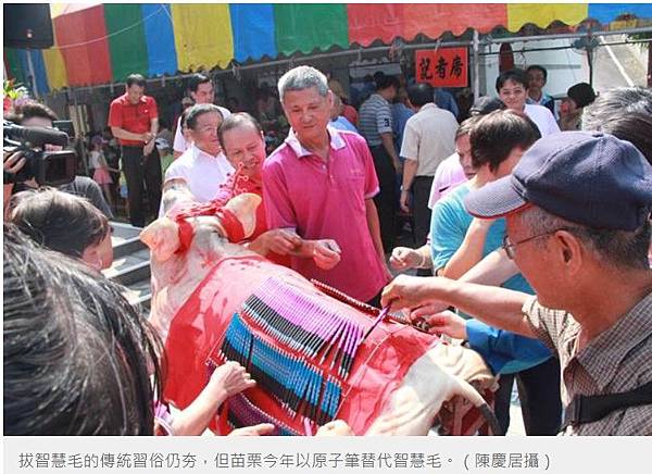 苗栗縣祭孔大典,由於過去2年教師節碰上颱風來襲,六佾舞未如期表演,今年頭屋國小特別加強演練,帶來更精湛演出。祭聖大典仍有全豬和全羊,今年不同往年的是,祭典後最夯的拔智慧毛,是以原子筆排列在布上,再披到豬羊身上,因此小朋友和家長拔到的智慧毛,是實用的原子筆。
