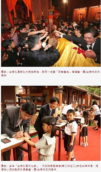 台南市於春、秋兩季依古禮舉辦春祭及秋祭大成至聖先師孔子釋奠典禮,春祭典禮於今天清晨6點舉行,由市長賴清德擔任正獻官,忠義國小學生擔綱跳六佾舞,全程採古禮進行,並獻祭真牛、真羊、真豬,歷時約1小時結束,場面莊嚴肅穆。