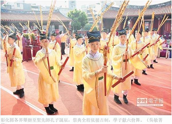 彰化縣各界舉辦至聖先師孔子誕辰,祭典全程依循古制,學子獻六佾舞。(吳敏菁攝)