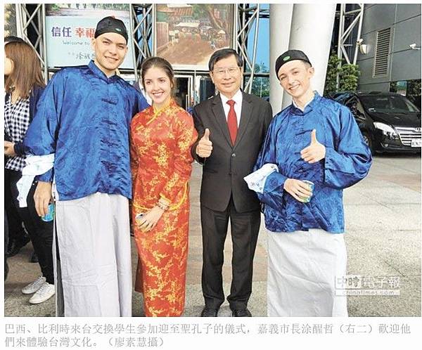 巴西、比利時來台交換學生參加迎至聖孔子的儀式,嘉義市長涂醒哲(右二)歡迎他們來體驗台灣文化。(廖素慧攝)