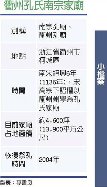 至於「南宗」由來,據「衢州孔氏南宗家廟志」紀載,北宋末年靖康之難後,孔子第48代嫡長孫孔端友隨著宋高宗南渡,率族人遷至衢州,史稱孔氏南宗。衢州孔廟為孔氏「南宗」所建立之家廟,並於2004年恢復祭孔,現任管委會主任委員為孔子第75代嫡長孫孔祥楷。
