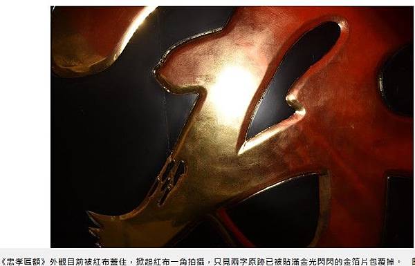 《忠孝匾額》外觀目前被紅布蓋住,掀起紅布一角拍攝,只見兩字原跡已被貼滿金光閃閃的金箔片包覆掉。 圖:蕭文杰/攝