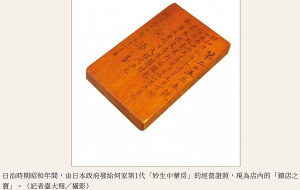 日治時期昭和年間,由日本政府發給何家第1代「妙生中藥房」的經營證照,現為店內的「鎮店之寶」。(記者臺大翔/攝影)