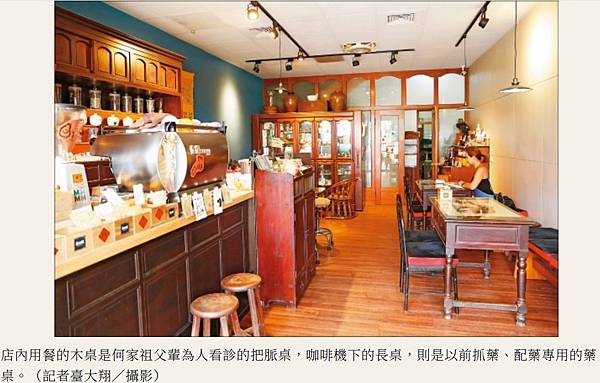 店內用餐的木桌是何家祖父輩為人看診的把脈桌,咖啡機下的長桌,則是以前抓藥、配藥專用的藥桌。(記者臺大翔/攝影)