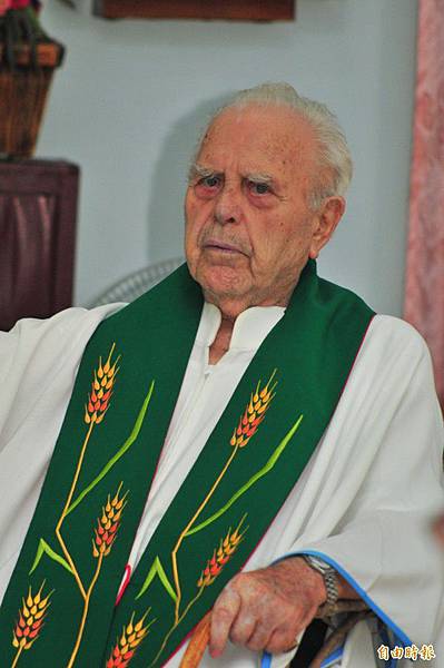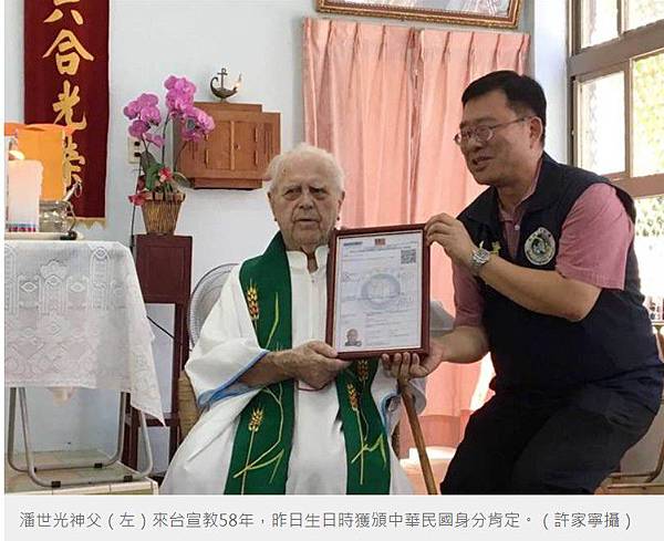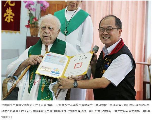 85歲法國籍天主教神父潘世光(中),在花蓮縣玉里鎮東豐教堂獲頒中華民國身分證。 ...