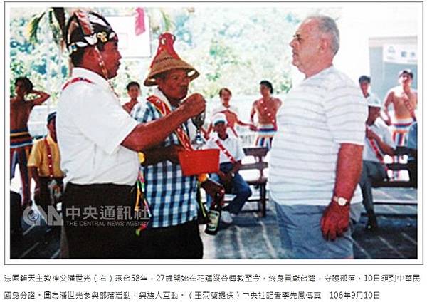 法國籍天主教神父潘世光(右)來台58年,27歲開始在花蓮縱谷傳教至今,終身貢獻台灣,守護部落,10日領到中華民國身分證。圖為潘世光參與部落活動,與族人互動。(王菊蘭提供)中央社記者李先鳳傳真 106年9月10日