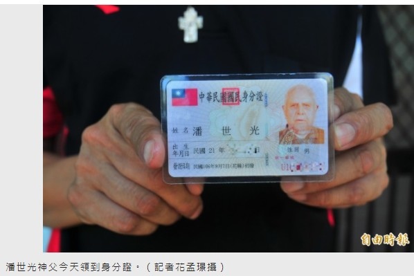 八十五歲法國籍天主教神父潘世光昨天在花蓮縣玉里鎮東豐教堂獲頒中華民國身分證,昨天也是潘世光生日,他熱淚盈眶說,「這生日禮物太值得紀念」。