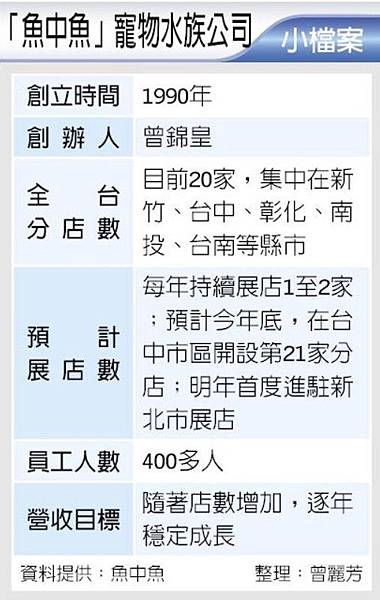 為搶攻每年逾500億元的寵物市場商機,總公司在台中的魚中魚,選擇各主要城市、主要幹道展店,全台20家通路店,分店集中於新竹、台中、彰化、南投及台南等縣市,明年將進軍新北市展店。梅國華表示,魚中魚創立將滿25年,10年前轉型複合式經營,引進狗、貓、小動物、爬蟲類等寵物,如今寵物相關業績已占總營收的6至7成,超越水族館的業績表現。