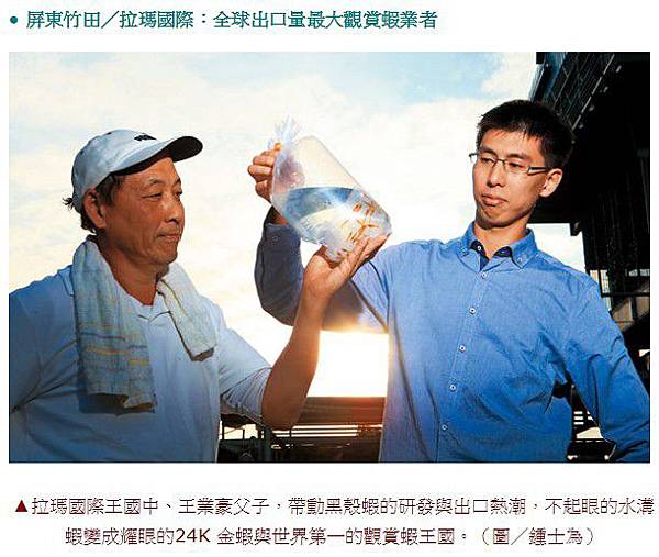 ▲拉瑪國際王國中、王業豪父子,帶動黑殼蝦的研發與出口熱潮,不起眼的水溝蝦變成耀眼的24K 金蝦與世界第一的觀賞蝦王國。(圖/鍾士為)