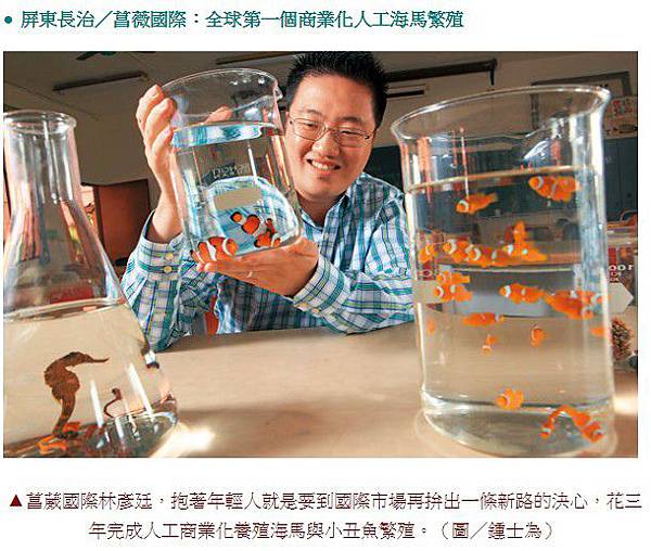 為何選擇繁殖海馬?二○○一年,林彥廷大學念水產養殖系,研究台灣觀賞魚產業,發現台灣處於養殖場多、出口商少的狀態。他知道如果年輕人有國際觀、敢去國際市場拚,一定有很大的空間。