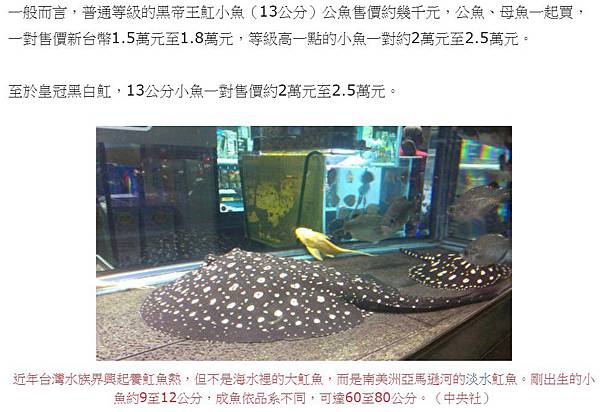 至於皇冠黑白魟,13公分小魚一對售價約2萬元至2.5萬元。1050827