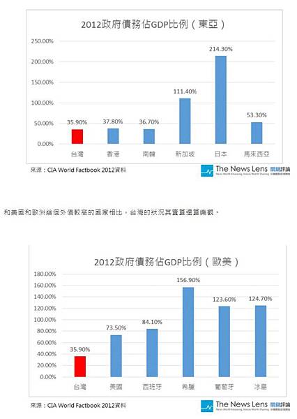 根據若根據IMF(國際貨幣基金)、OECD(經濟合作與發展組織)等定義,政府債務不列入社會保險給付義務等「潛藏債務」。政府債務佔GDP的比例,我們目前為38.6%。根據美國中央情報局(CIA)的資料,截至去年底,四小龍的南韓36.7和我們差不多、新加坡111.4%比我們高、香港37.8%差不多;其他國家如馬來西亞53.3%、日本為214.3%則是嚴重許多。