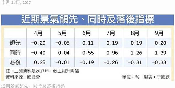 ■落後指標構成項目有:失業率、工業與服務業受僱人數、製造業單位產出勞動成本指數、金融業隔夜拆款利率、全體貨幣機構放款與投資、製造業存貨率等6項指標。