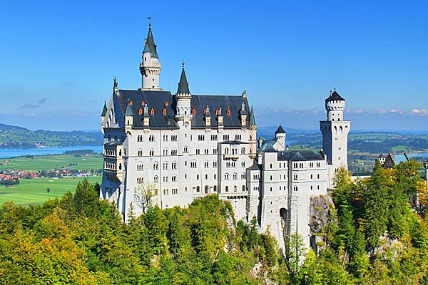 新天鵝堡全名新天鵝石城堡,位於德國巴伐利亞西南方,與年代較早的高天鵝堡(Schloss Hohenschwangau,又稱舊天鵝堡)都毗鄰菲森市。此建築是巴伐利亞國王路德維希二世的行宮之一,共有360個房間,其中按設計建造好的僅有14間。城堡內部有紅色迴廊、僕人房、起居室、小暖房、國王宮殿、陽台、禮拜堂、遊戲房、歌手廳等供遊客參觀,旁邊的巴伐利亞國王博物館(Museum der bayerischen Könige)內精心陳列了大量歷史資料和實物,特別是國王的王袍最為吸引人。乘坐火車遊覽城堡及周圍森林風景,也是非常不錯的選擇。