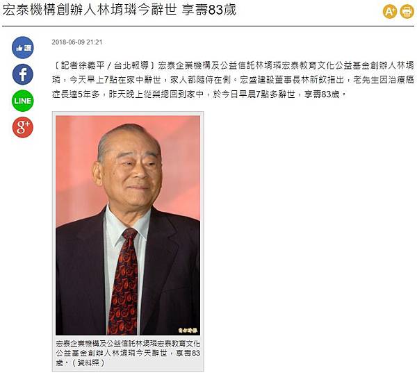 分享宏泰機構創辦人林堉璘今辭世 享壽83歲到Facebook 分享宏泰機構創辦人林堉璘今辭世 享壽83歲到Line 分享宏泰機構創辦人林堉璘今辭世 享壽83歲到Google+