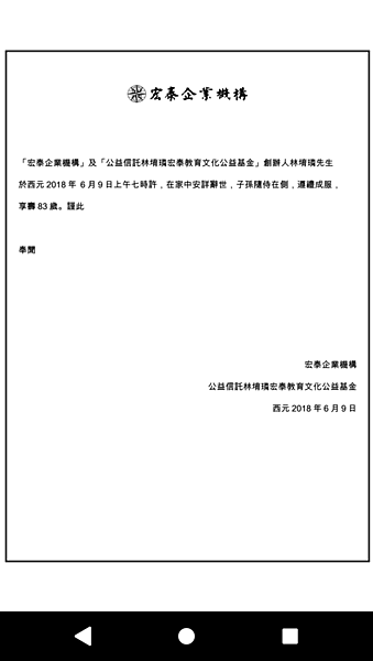 宏泰機構今晚也發表聲明稿證實,表示林董辭世時子孫隨侍在側,目前並未決定是否舉行告別式。