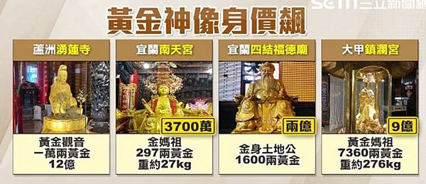 除了蘆洲湧蓮寺,宜蘭南天宮金媽祖用了297兩黃金,身價也有3700萬;宜蘭四結福德廟金身土地公使用1600兩黃金,飆上兩億;大甲鎮瀾宮的黃金媽祖,7360兩黃金更是直逼9億元。