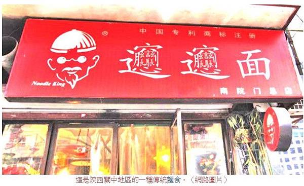 這是陝西關中漢族的傳統風味麵食,又名褲帶麵,通常藉由手工拉長成寬厚的麵條。據說其麵條在擀製和拉扯過程中,還有撈出和調味攪拌時,均會發出「biang」「biang」的聲音,因而得名。