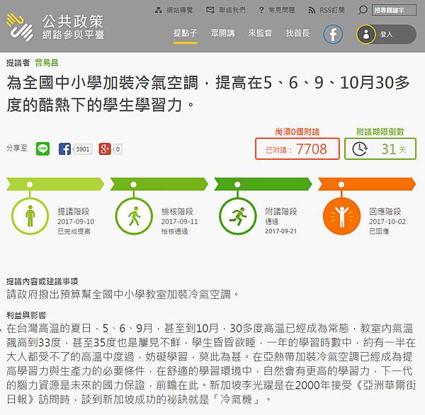 提議網友認為,在亞熱帶加裝冷氣已成提高學習力、生產力的必要條件,在舒適的學習環境中,自然會有更高的學習力,下一代的腦力資源是未來的國力保證。最後還提到新加坡前總理李光耀曾說過,「新加坡成功祕訣就是冷氣機」為例,希望為「為全國中小學加裝冷氣空調,提高在5、6、9、10月30多度的酷熱下的學生學習力」。