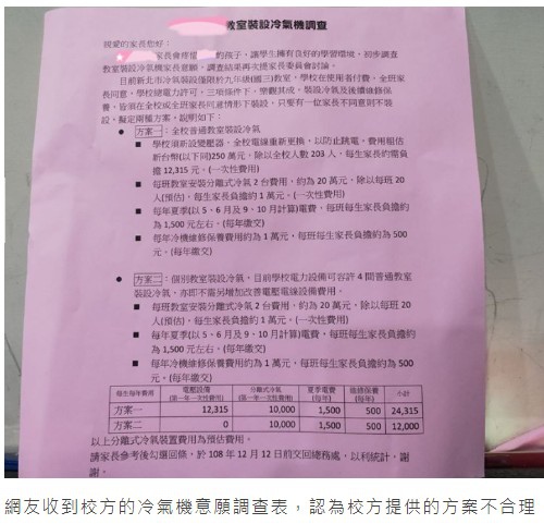 方案一:全校普通教室裝設冷氣,家長每人支付2萬4千315元,方案二:個別教室裝設冷氣,家長每人支付1萬2千元。原Po詢問「身為家長的你們,會為了四個月可以吹冷氣而花這筆錢嗎?」,並解釋孩子因為學區問題無法轉學,直批校方「根本是獅子大開口,這屆家長又不是凱子」。