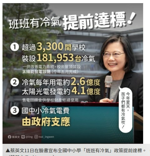 昨在行政院會上,教育部報告全國中小學「班班有冷氣」政策提前達標。總統蔡英文今(11日)透過臉書宣布此消息,指出全台超過3300間中小學,已經裝設完成超過18萬台冷氣,且冷氣電費將由政府支應。
