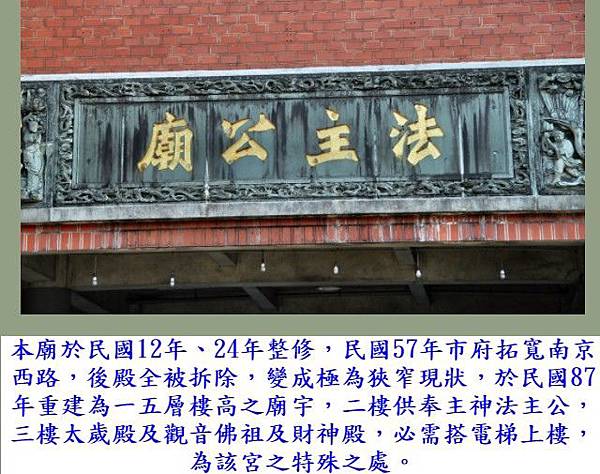 網路提及日據時期因市區改正,法主公廟後殿就被拆掉了....可能有些錯誤,日據時代(西元1909年)市區改正法主公廟反而投下了數千圓修繕。