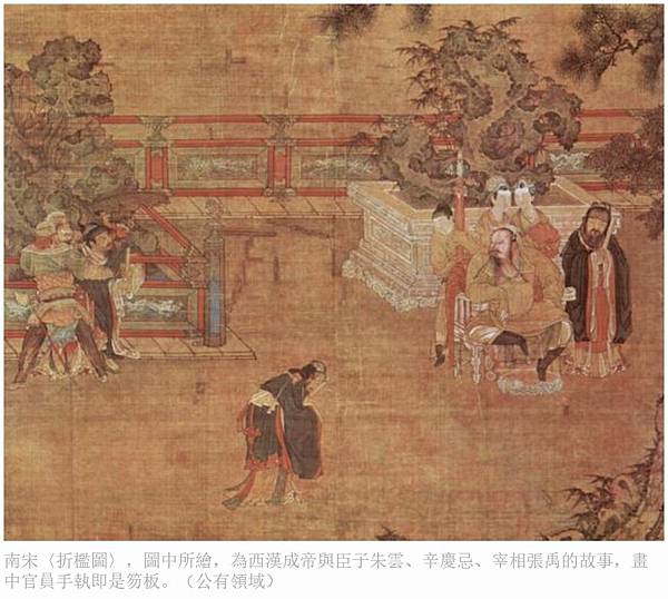 南宋〈折檻圖〉,圖中所繪,為西漢成帝與臣子朱雲、辛慶忌、宰相張禹的故事,畫中官員手執即是笏板。(公有領域)