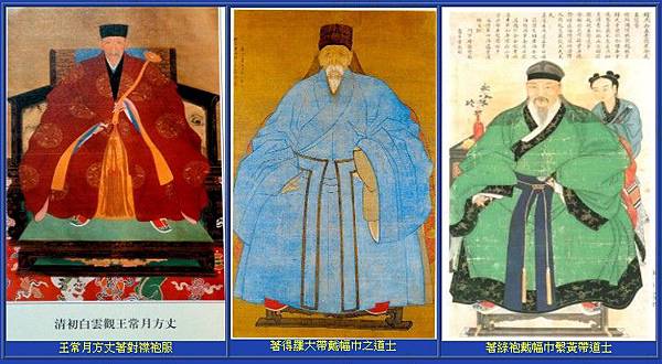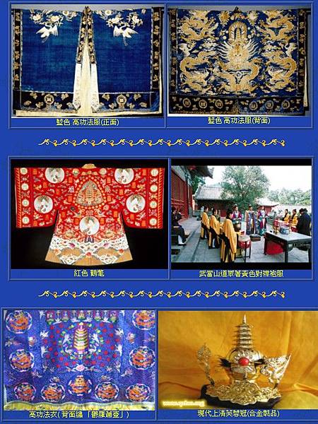 經衣:經衣也是對襟袍服,但腰間縫有大帶,身前由領下綴龍虎帶。如在全真道傳戒,方丈升座時,左右道童亦用此種款式之藍道服,而道眾之經衣顏色不外乎紅色、黃色二種顏色。